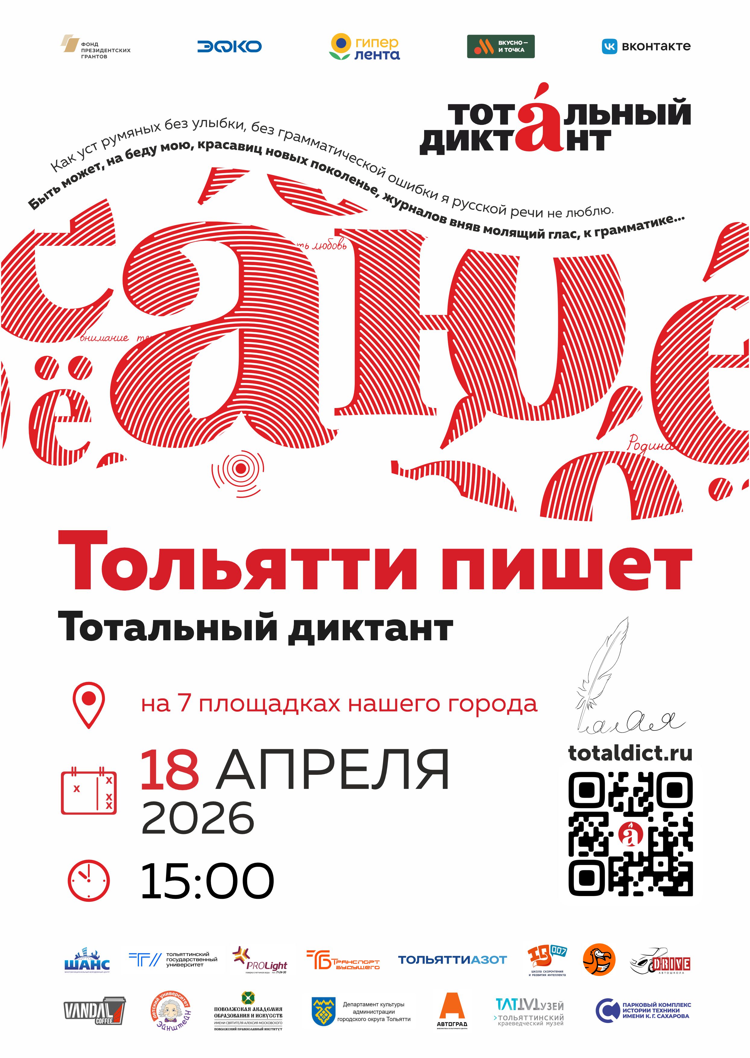 Тольятти напишет Тотальный диктант 18 апреля 2026 года в 15:00 на 7 площадках нашего города! Приглашаем всех жителей и гостей